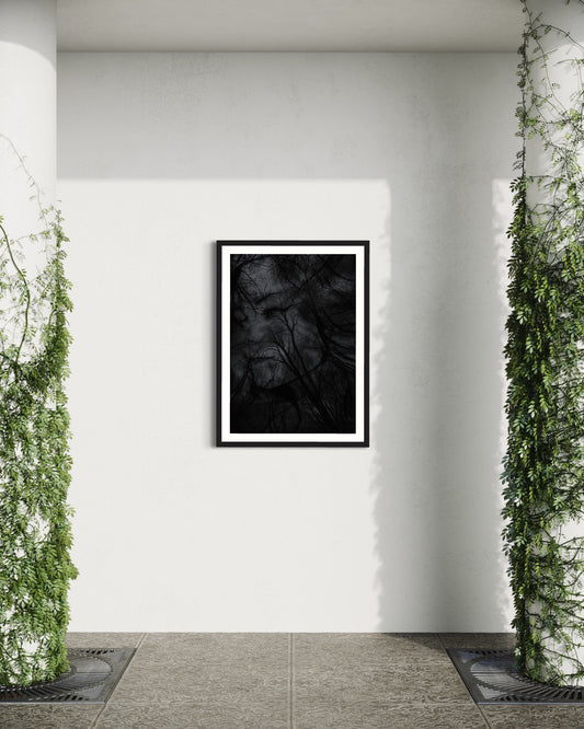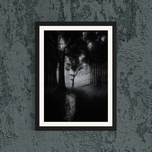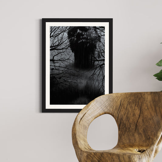 Affiche Encadrée : Tableau Effet d'Optique - Visage Dissimulé dans une Forêt Sombre